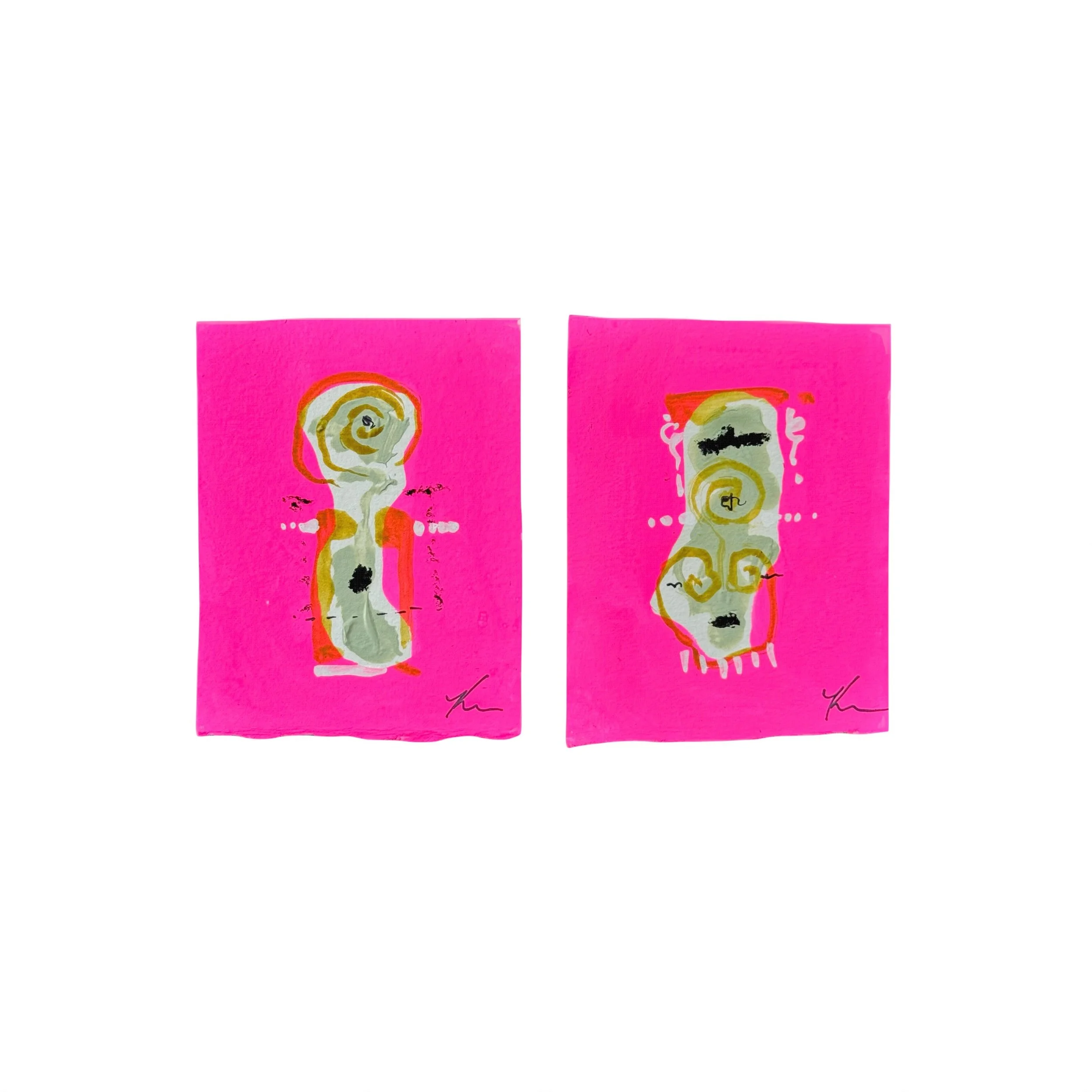 acrylic, ink, oil pastel, and charcoal on heavy hand torn watercolor paper. All personnage minis vary from 3”-5” individually. Size may vary.