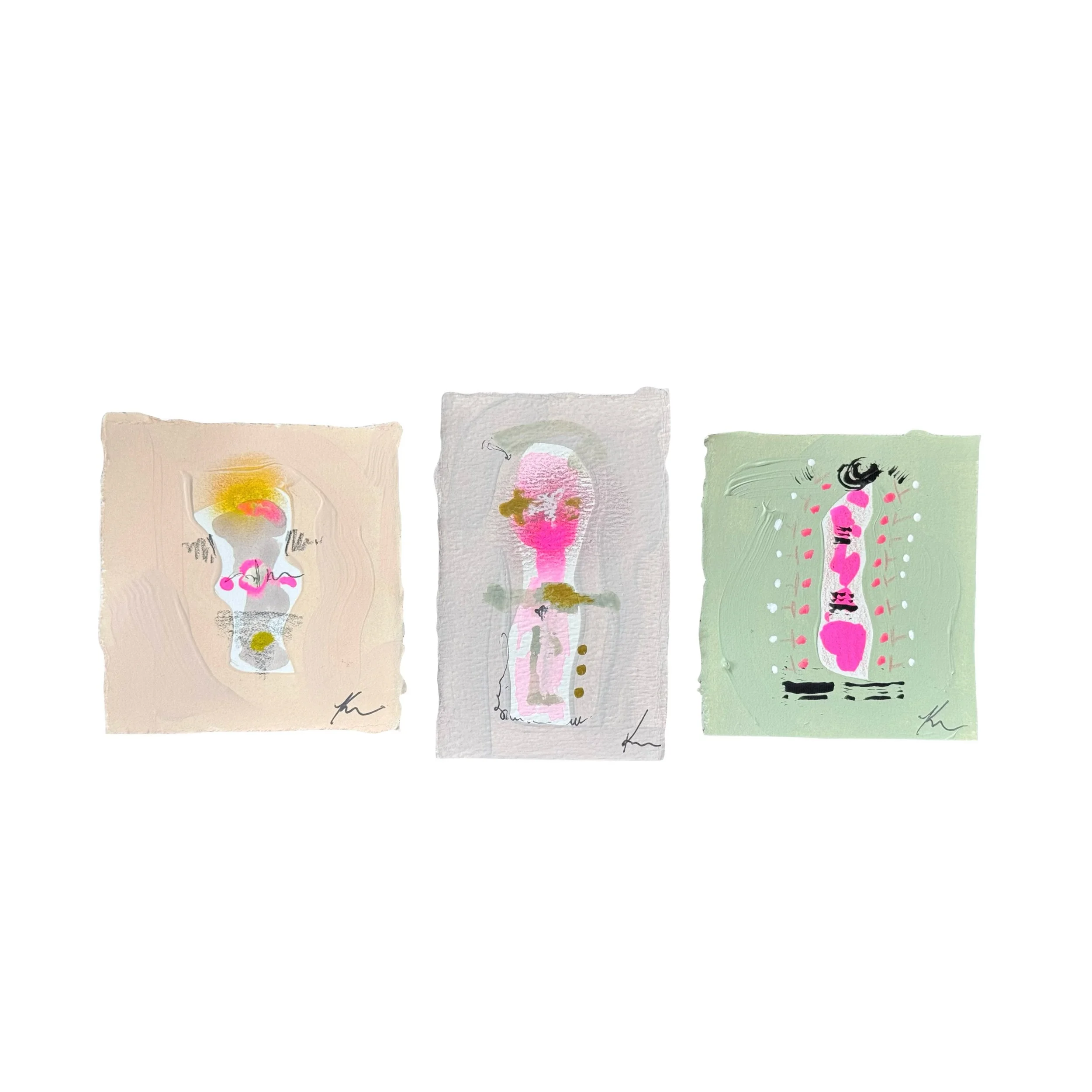 acrylic, ink, oil pastel, and charcoal on heavy hand torn watercolor paper. All personnage minis vary from 3”-5” individually. Size may vary.