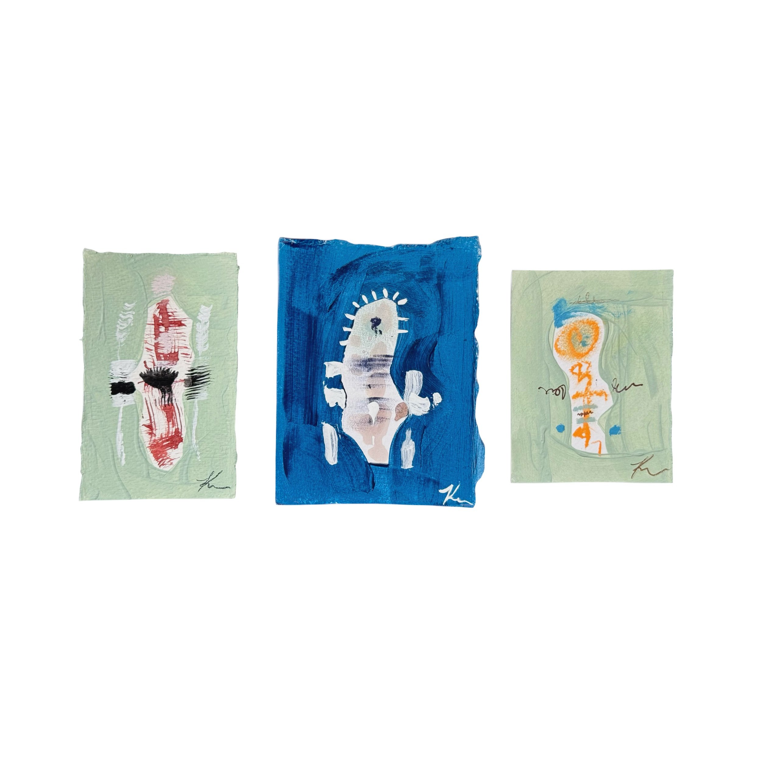acrylic, ink, oil pastel, and charcoal on heavy hand torn watercolor paper. All personnage minis vary from 3”-5” individually. Size may vary.
