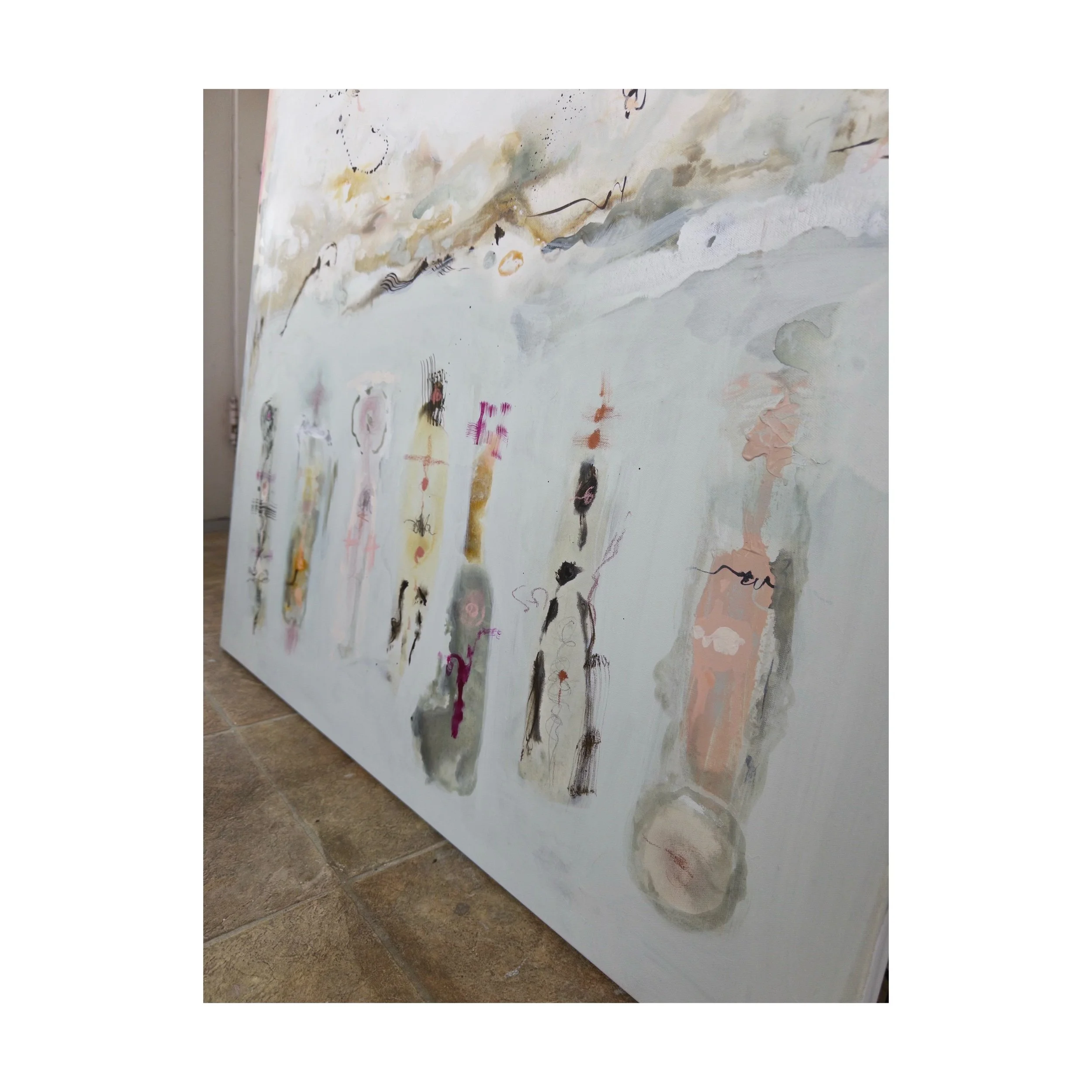acrylic, ink, oil pastel, and charcoal on 36x36x1.5” stretched canvas.